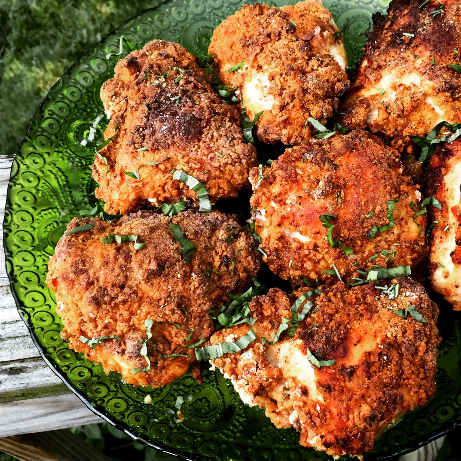 - 1 family pack chicken thighs, bone in and skin on, trimmed of excess fat, about 11-12 pieces